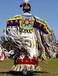 To these hardcore powwow folks, the arena is a sacred but fun place, with its heartbeat residing in the music. "I like the songs, beautiful songs, that's the secret at a powwow," says White. "It's good medicine." The songs are divided into two main styles, northern and southern. Northern singers have a much higher pitch than the deep tones of the southern singers. Some songs have words while others are pure chanting. For example, an honor song might be composed for someone who has recently returned from war or the military, or for someone who recently passed away. Other songs provide ladies the chance to ask that special man to dance. Yes, at powwows, songs for sweethearts are strictly ladies choice! You'll know it's safe for anyone to join the dancing when the MC calls for an "inter-tribal dance."